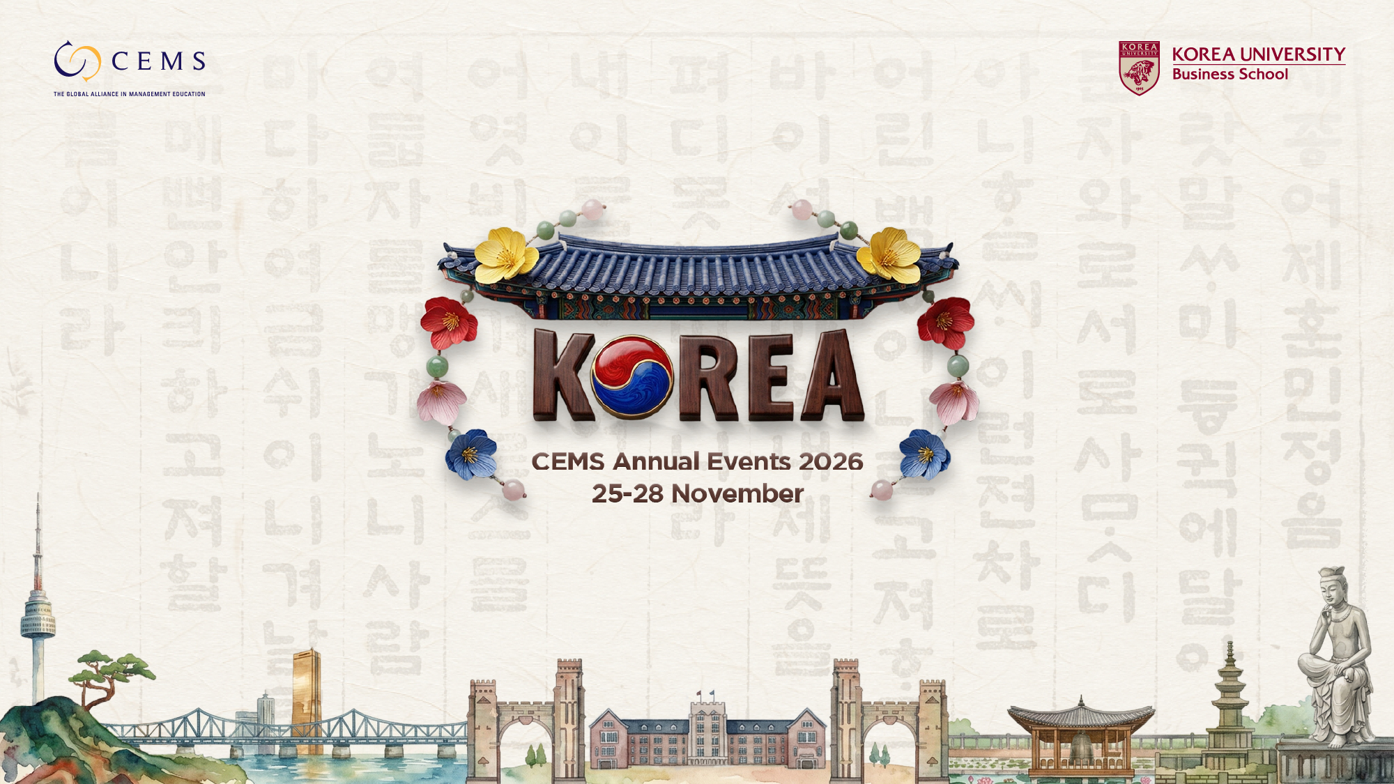 The logo brings together elements rooted in Korea’s history to trace a progression—from academic achievement to leadership and, ultimately, to social contribution—aligned with the values of CEMS. It is composed of three interconnected parts: the central motif, the lower section, and the background.